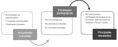 Desde un enfoque de investigación-creación,5 los participantes realizaron actividades que promovieron la indagación y resolución de problemas, apoyados en las tecnologías de la información y las comunicaciones6 (TIC) como herramientas de mediación de nuevas formas de investigación y de generación de emprendimientos culturales. Para promover el uso y la apropiación de la cultura utilizaron estrategias pedagógicas como la realización de los microproyectos,7 el uso de las TIC8 y las actividades de popularización,9 por nombrar algunas. Esto bajo el liderazgo de docentes-mediadores y técnicos especializados en las áreas de sistemas, video y audio. En la Figura 3 se presentan los principales datos del programa de formación.
