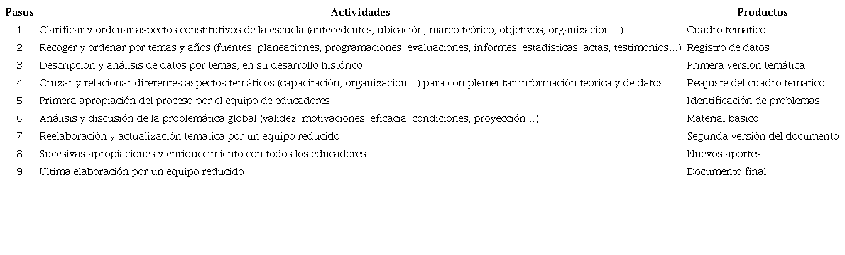 Como el principio de este enfoque de investigación afirma que uno de sus rasgos de alternatividad es la producción colectiva de conocimiento, los asesores distribuyen las tareas entre los participantes y ellos mismos, dependiendo del conocimiento o habilidades de aquellos. Me referiré a la ya citada planeación de Filodehambre (1987) porque ilustra las tareas y algunos criterios para asignarlas; es útil ahora para mostrar y describir la complejidad de estas. Los participantes de esta planeación son profesores (además de algunos padres de familia y niños). La sistematización divide las funciones de otro modo porque supone las habilidades de los profesores, así como que en grupo se pueden abordar algunas de las más complejas para que la gente aprenda, de paso, cómo se hace. Según el documento, hay tareas colectivas (pasos 1, 4, 5, 6 y 8), otras en pequeños grupos (2 y 3) y algunas las asume un equipo más reducido durante tiempos adicionales a los talleres y encuentros con los participantes (7 y 9). La mayoría de tareas se realizan en grupo con el objetivo de que todos aprendan a hacerlas, pero para avanzar se necesita más tiempo y esfuerzo, así que poco a poco se van reduciendo según su complejidad, no en el mismo orden que están planeadas.