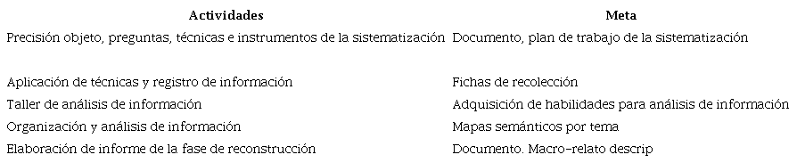 La capacidad metacognitiva de esta activación de la memoria implica otras operaciones analíticas: "categorizar, periodizar, tipologizar que deben hacerse por medio de procedimientos sencillos" (Torres, 2003, p. 211) para "explicitar la comprensión de las prácticas desde los sentidos que fueron producidas" (Mejía, s. f., p. 4). La promesa de esta fase es que si los participantes van "más allá del sentido común, si colocan y usan los dispositivos suficientes, [serán] capa[ces] de producir una organización de su práctica en categorías que son capaces de conformar un cuerpo de saber" (p. 15).