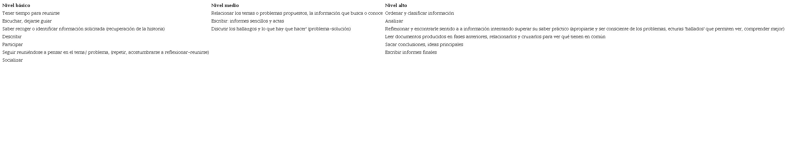 De acuerdo a los logros y dificultades que señalan los sistematizadores (siempre al final de los informes), quise hacer otra clasificación. Dividí las tareas por niveles: básico, medio y alto (véase la Tabla 4). Esta típica clasificación refleja las subtareas y habilidades necesarias para investigar -que equivale a sistematizar-, aunque varias de ellas no se nombren en el corpus o se nombren aisladamente y se deseen no a un altísimo nivel, pero sí a uno que permita acceder a "otras lecturas".