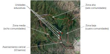 En la Figura 1 se observan los 119,3 km2 del territorio de Kisapincha, los puntos rojos son los cuatro servicios educativos actuales (UE) y las flechas señalan las áreas geográficas en las que están divididos según el Gobierno Autónomo Parroquial de Kisapincha (zona alta, media y baja); donde antes existían escuelas, ahora todas se concentran en la parte media y baja.