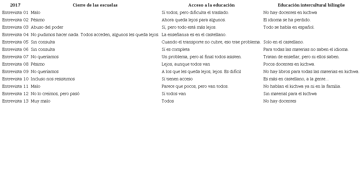 Una vez que se recopilaron y sistematizaron las entrevistas se evidenciaron tres aspectos. En primer lugar, el disgusto y la incomodidad producidos por el cierre de escuelas localizadas en el seno de las comunidades. En segundo lugar, aunque todas las personas entrevistadas manifestaron que el derecho al acceso a la educación se logró, las condiciones de distancia y los tiempos de traslado se vieron alteradas y causaron molestia. En tercer lugar, salieron a flote las dificultades de fortalecer la educación intercultural bilingüe, en particular la enseñanza del idioma indígena kichwa.