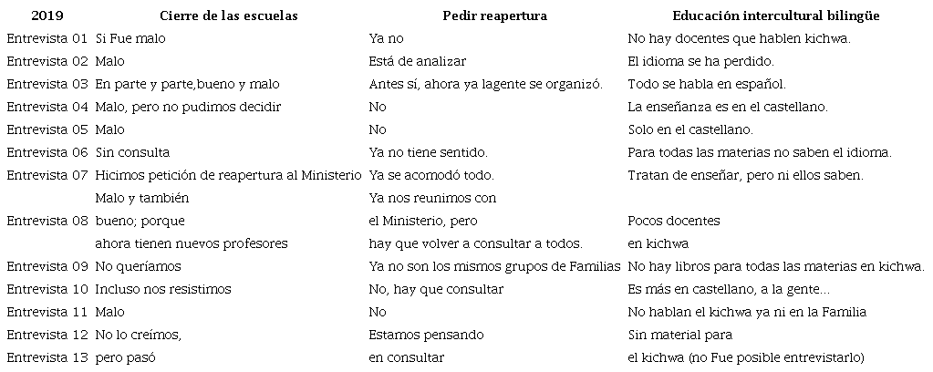 En el 2017, las entrevistas arrojaron tres códigos: cierre de escuelas, acceso a educación y educación intercultural bilingüe. En el 2019, se registraron tres códigos: cierre de escuelas, pedir apertura y educación intercultural bilingüe. Para la organización de las entrevistas se empleó el software Atlas ti. En la Tabla 1 se presentan los resúmenes de los códigos.