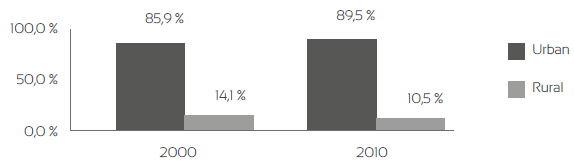 In Vitoria da Conquista, IBCE data (2010) reveal a reality that confirms the field exodus of the field population. Graph 1 shows the reality of this municipality as to the distribution of the population in urban and field areas. Following a national tendency, the predominance of population of the municipality in the urban area is evidenced by the graph, while the field population has reduced considerably, mainly during the last decade. This is the result of a phenomenon that can be verified throughout the country, the migration of people from the countryside to the cities. This sounds contradictory, because it is always possible to see the strength of the countryside, even with the exclusion of these people to the city and with the arrival of the capitalist-type agribusiness that removes it from its housing environment. We note the need for people's return to the countryside to make the subsistence of cities possible (Santos, 2016). In Vitória da Conquista this phenomenon is not different. There is an urgent need for actions that guarantee the return of these people to the peasant space, to their roots, and the resumption of land work.