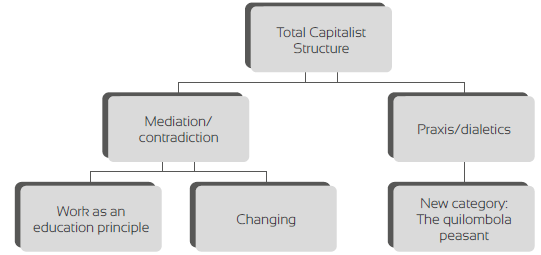 However, one of the contradictions found within this dichotomous society that transforms work as a way of alienation and not a mechanism to educate is that reparation of public policies-namely, the public policy of quilombola school education-that need to be recognized by the municipal public power and implemented as mechanisms which, in the social praxis exercised by members of the quilombola community, become educational work, as they are means of struggle to guarantee their own existence. Notice that the organization shown in the chart is by no means hierarchical, since we understand that these categories exist within the multiple determinations of a phenomenon. It is just a proposal to reflect upon the way in which they constantly overlap in this subject that, through labor, becomes aware of its own existence.