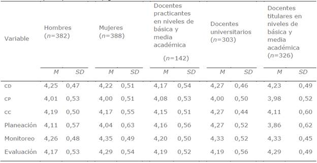 Las estadísticas descriptivas de la muestra por variable, género y tipo de desempeño profesional se presentan en la tabla 1. La tabla 2 muestra correlaciones bivariadas de orden cero para las variables metacognitivas por género. Por su parte, la tabla 3 detalla las correlaciones bivariadas de orden cero para las variables metacognitivas para los docentes practicantes en niveles de básica y media académica (en su último semestre de formación), y docentes titulares en niveles de básica y media académica; mientras que la tabla 4 hace lo mismo para los docentes universitarios.