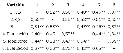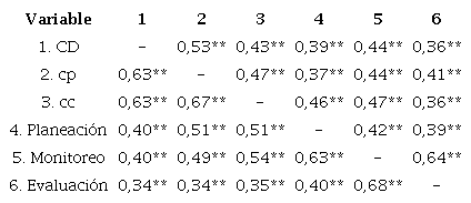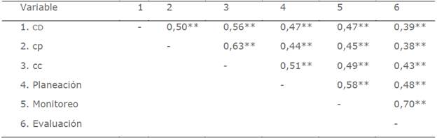 Es interesante observar que los participantes tienden a calificarse altamente en las variables metacognitivas, lo que sugiere que se consideran altamente conscientes de sus habilidades metacognitivas (tabla 1).