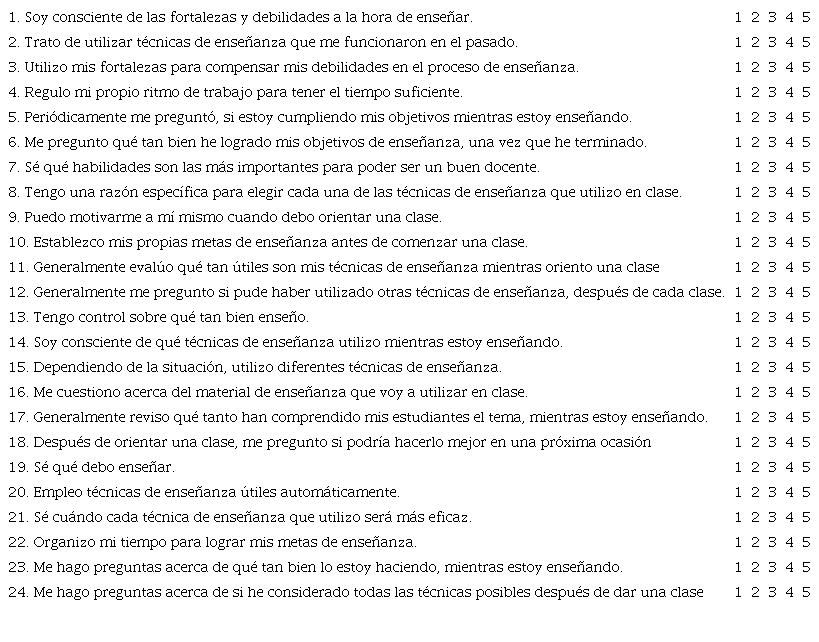 El cuestionario se estructura con un formato de respuesta tipo Likert de 5 puntos, en el que el grado de acuerdo varía desde totalmente en desacuerdo (1) hasta totalmente de acuerdo (5). La puntuación se proporciona de la siguiente manera: totalmente en desacuerdo (1), en desacuerdo (2), neutral (3), de acuerdo (4), totalmente de acuerdo (5). Los resultados del alfa de Cronbach en las investigaciones alrededor del instrumento han permitido reconocer una alta confiabilidad para su uso en ciencias de la educación. Así, el alfa de Cronbach reportado para la prueba varía desde 0,79, para el caso de la habilidad de evaluación, y va hasta 0,85, para el caso del conocimiento declarativo (Balcikanli, 2011). Para la presente muestra, los coeficientes de confiabilidad de consistencia interna, los alfa de Cronbach variaron de 0,78 a 0,86 para las seis escalas del MAIT-24 (ver anexo, para obtener una copia del instrumento MAIT-24 empleado en el presente estudio).
