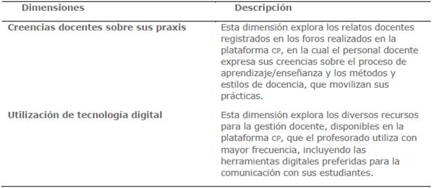 Específicamente, analizamos las creencias y prácticas docentes develadas en los mensajes textuales registrados en los foros en una CP basada en Moodle. Adicionalmente, revisamos los recursos disponibles de dicha plataforma, que el profesorado visita con mayor frecuencia. En la tabla 1 sintetizamos las dimensiones de análisis seleccionadas, su descripción y aspectos críticos que las constituyen.