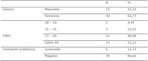 Para este estudio consideramos a toda la población docente que conforma el equipo del sello formativo1 de una universidad privada chilena (N = 45), correspondiente a 30 mujeres y 15 hombres (66,7 % y 33,3 %, respectivamente), como se muestra en la tabla 2. Es importante señalar que este estudio se realizó en plena implementación de un proyecto de innovación curricular basado en el modelo de aula inversa ( flipped classroom).
