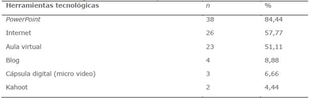 Casi la totalidad del profesorado (84,44 %) señala trabajar las presentaciones PowerPoint en sus clases, constituyéndose este recurso tecnológico como el más utilizado para fines formativos (tabla 4). Esta práctica podría evidenciar el enfoque de clase expositiva que prima en la mayoría de las propuestas del profesorado estudiado.
