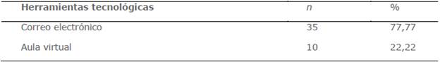 La mayoría de este personal docente continúa comunicándose con sus estudiantes a través del correo electrónico, desaprovechando el aula virtual como componente troncal del método de aula inversa del proyecto de innovación curricular en curso (tabla 5). En este espacio virtual se ha alojado una serie de actividades y recursos para el aprendizaje (carpetas con diversos documentos de estudio, videos, guías de autoaprendizaje, tutoriales ad hoc, foros, enlaces de interés, etc.).