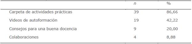 Complementariamente, se revisaron los recursos disponibles en la plataforma CP que el personal docente visita más frecuentemente, encontrándose que la mayoría (86,66 %) visita la carpeta de actividades prácticas para potenciar el aprendizaje cooperativo, que incluye estudios de casos, juegos de roles y juegos serios (tabla 6). No obstante, en este mismo espacio se comparten otros recursos como, videos y sugerencias metodológicas para una mejor docencia, que buscan fomentar buenas prácticas docentes. Adicionalmente, existe un espacio para colaborar con actividades de aprendizaje cooperativo, orientadas a potenciar la fase de experimentación activa del proyecto de innovación curricular, que se desarrolla en el aula física (espacio grupal).