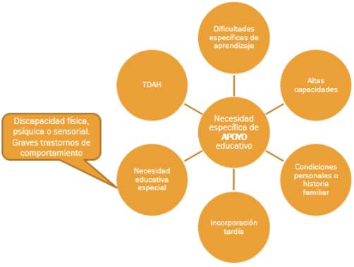 Según señala Tenti (2008), pese a sus buenas intenciones (reducir disparidades, mejorar las oportunidades de aprendizaje de los más pobres, compensar diferencias en la calidad de la oferta, etc.), el impacto de los programas tanto en términos de mejoramiento de la calidad de la oferta como de la probabilidad de escolarización o aprendizaje efectivo del alumnado de los grupos sociales más desfavorecidos, lo cierto es que tienen potencialmente algunos efectos perversos, entre otros la estigmatización y el etiquetado. En definitiva, tropezamos con una tipología o catalogación no muy acorde con el modelo inclusivo, aunque asumida posteriormente por la Ley orgánica 8/2013, de 9 de diciembre, para la mejora de la calidad educativa (LOMCE) y que, de forma más ilustrativa, se puede ver en la figura 1.