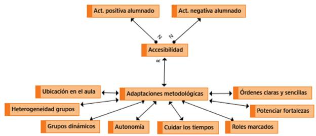 Es necesario que las actividades propuestas sean accesibles, sobre todo en alumnado con NEAE, ya que, por un lado, aumentan la motivación e interés en estas, y por otro, se ha evidenciado que fomentan actitudes más positivas en el aula. Estas desembocarán, tal y como puede observarse en la tabla 4 -elaborada mediante los datos recabados de las entrevistas y grupos de discusión-, en un ambiente de trabajo más distendido y agradable; en una predisposición mayor hacia las tareas y a mejorar las relaciones con sus iguales y con los adultos.