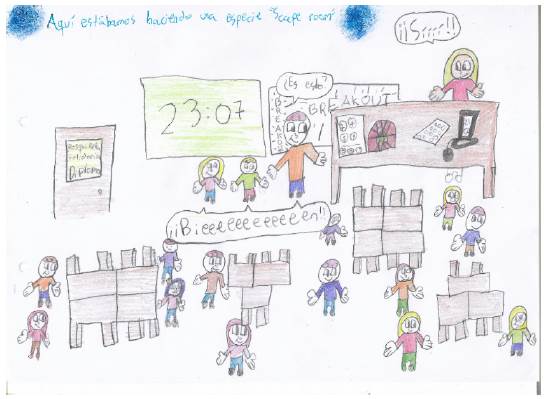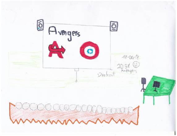 También es importante crear ambientes distendidos de aprendizaje, en los que se sientan bien y que se pueden conseguir a través de la propia decoración del aula o del centro. Sobre esto, en la figura 4 se muestra un dibujo de un alumno de sexto, en el que se refleja una actividad gamificada ambientada en la historia de Los Vengadores, en la que los docentes utilizaron un video introductorio de la actividad que se proyectó en la pizarra digital interactiva y que unía la historia de la película con la narrativa de la actividad.