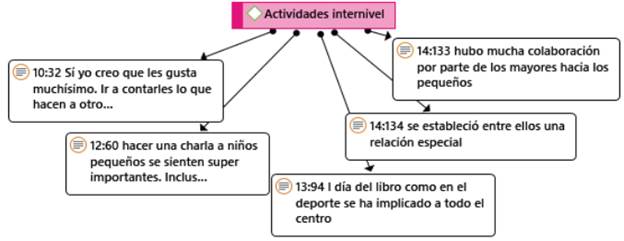 El último indicador analiza la participación de la comunidad educativa en las actividades del centro y los recursos que la localidad y el contexto les pueden aportar (C2.14). Si se considera como comunidad educativa a las familias (padres, madres, tíos, abuelos...) y al resto de alumnado del centro, que se relacionan con niños y niñas de otras edades a partir de las actividades internivel. Del análisis de los indicios se desprende que es un aspecto que, hasta el momento, no se le ha dado la importancia que merece en el proceso de enseñanza y aprendizaje. Como hemos observado, influye mucho en la implicación y participación del alumnado: "que los papás se involucren en su enseñanza, les encanta" (EP1, 173). Pues todo el alumnado y profesorado entrevistado reconoce que al alumnado le gusta y le motiva la participación de sus familias y las actividades internivel. Además de influir en su actitud, también les ayuda a desarrollar habilidades como hablar en público y facilita las relaciones entre alumnos y alumnas de distinta edad, tal y como se puede comprobar en la figura 6.