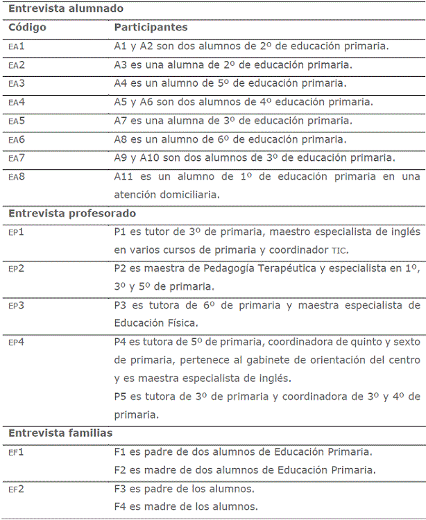 Por último, se han realizado 14 entrevistas individuales y grupales a profesorado, alumnado y familias, y dos grupos de discusión con familias y profesorado (tabla 2), que nos han permitido obtener información más profunda y completa del fenómeno estudiado, ofreciendo a los participantes la oportunidad de esclarecer dudas y dar respuestas más útiles y opiniones más reflexionadas (Díaz-Bravo et al., 2013).