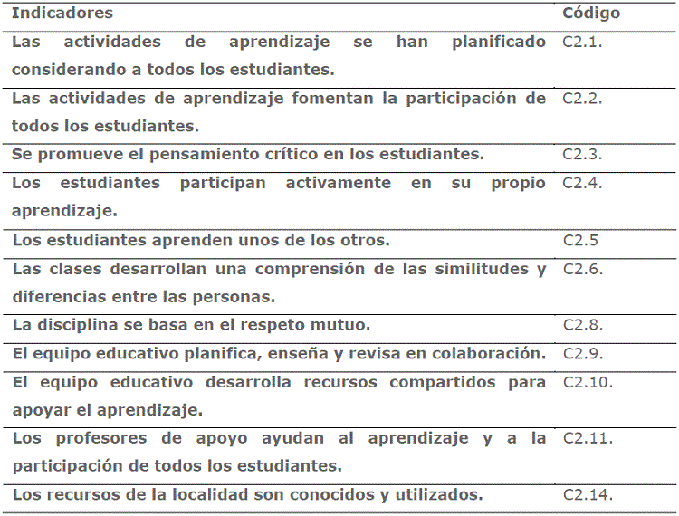 Cabe destacar que se ha empleado en el trabajo de campo, además de las técnicas anteriormente referidas al index for inclusion (Booth y Ainscow, 2011), un documento muy útil y completo para analizar el grado de inclusión de un centro educativo. Abarca tres dimensiones, de las cuales nos vamos a centrar en la C que es la que contempla las prácticas educativas; más concretamente, en la sección C2, denominada "Orquestando el aprendizaje", que analiza cómo se enseña y se aprende por guardar relación con nuestro objeto de estudio. Esta sección se desglosa en 14 indicadores, de los que se han escogido 11 (tabla 3), y que son los que se detallarán en este estudio para valorar el grado de inclusión educativa de alumnado con NEAE.