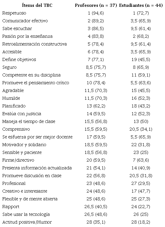 Las respuestas de los participantes al TBC fueron ordenadas de mayor a menor importancia, de acuerdo con la puntuación promedio obtenida por cada característica. Como se observa en la tabla 1, para los profesores las cinco características más importantes en un docente universitario fueron: respetuoso, comunicador efectivo, sabe escuchar, demuestra pasión por la enseñanza, y proporciona retroalimentación constructiva. Entre tanto, los estudiantes eligieron las siguientes características: respetuoso; demostrar pasión por la enseñanza; comunicador efectivo y accesible a los estudiantes (con igual puntuación); y promueve el pensamiento crítico y se esfuerza por ser un mejor docente (con igual puntuación).