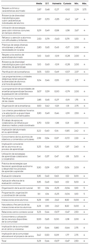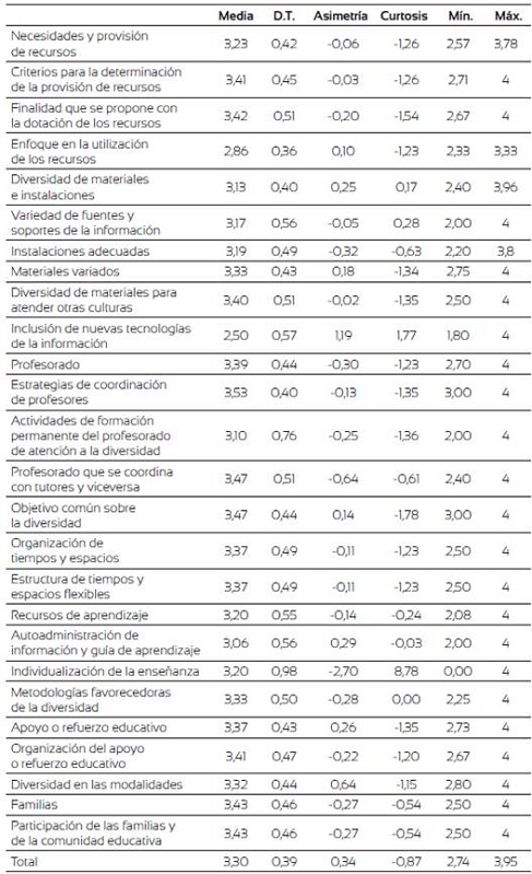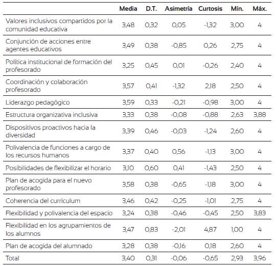 A continuación se señalan por orden de valoración: a) liderazgo pedagógico fue el mejor valorado (x̅=3,59), destacando así el apoyo y empuje por parte de los equipos directivos hacia esa dirección; b) plan de acogida del nuevo profesorado (x̅=3,58) le sigue, poniendo de relieve la ayuda prestada a los docentes recién incorporados; c) coordinación y colaboración (x̅=3,57) se valoró positivamente, aunque cabe reseñar que se destacó la coordinación de ciclo ante la de aula, ya que el ítem "Se ha dispuesto de un tiempo para la coordinación de los docentes que trabajan juntos en el aula" obtuvo un 3,20, resultado estimado como mejorable, siendo imprescindible para dar respuesta a las necesidades de los estudiantes; d) conjunción de acciones compartidas (x̅=3,49) ocupa un lugar destacado en la valoración, acentuando la colaboración familia y escuela, aunque el ítem "La familia conoce los principios de no discriminación e inclusión a través de sus documentos oficiales" (x̅=2,53) se estimó como aspecto a mejorar; e) valores inclusivos compartidos (x̅=3,48) se compone de ítems sobre la identidad e idiosincrasia del centro que fueron positivamente estimados, aunque, por su calado en la práctica, cabe destacar como mejorables los siguientes ítems: "Las familias no tienen inconveniente en que en clase de sus hijos haya niños de diferentes culturas" (x̅=2,87), "El profesorado tienen una actitud favorable a la incorporación de alumnado con necesidades especiales o características diferentes al centro" (x̅=3,07) y "El profesorado considera que los alumnos con necesidad específica de apoyo educativo deben compartir aula y currículum con el resto de alumnado" (x̅=3,20); f) coherencia del currículo (x̅=3,46), subrayando el hecho de compartir unos criterios claros en los elementos clave de la programación aunque estimaron mejorable "actualizarlo con más periodicidad" (x̅=3,20); g) flexibilidad de los agrupamiento (x̅=3,47) obtuvo un resultado positivo pues se compone de ese único ítem; h) dispositivos proactivos hacia la diversidad (x̅=3,39) que inciden en la propuestas inclusivas contempladas en los documentos oficiales del centro aunque este resultado roza la puntuación considerada susceptible de mejora; i) polivalencia de funciones (x̅=3,37), en cuanto a intercambio de roles; j) estructura organizativa inclusiva (x̅ =3,33), donde el ítem "Se prefieren las formas de apoyo ordinarias (para todos) frente a las específicas, utilizando estas solo cuando las primeras no han funcionado" obtuvo un 3,07.