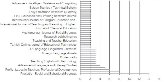 Como se observa, la revista Procedia - Social and Behavioral Sciences (Elsevier) tiene el mayor número de publicaciones con 14 artículos en el periodo de 10 años contemplado, seguida de la revista Profile: Issues in Teachers' Professional Development (Universidad Nacional de Colombia) con ocho artículos; en las demás, se registra la publicación de dos o tres artículos en el mismo periodo.