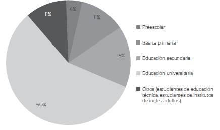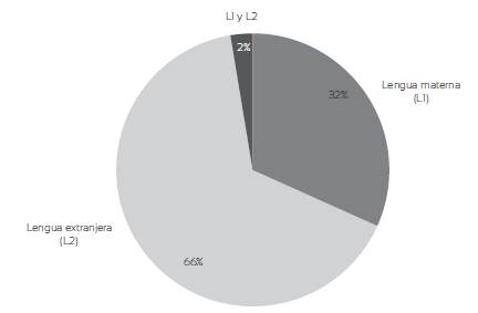 Se encontraron 81 artículos (66 %) en L2 frente a 39 en L1 (32 %), además de tres experiencias bilingües. De los 81 artículos, 51 tienen como destinatarios estudiantes universitarios; 8, estudiantes de educación primaria; 12 artículos la educación secundaria; 1, preescolar, y 7, otros destinatarios. En L1 se encontraron 21 artículos en el nivel universitario; 8 en el nivel secundario; 7 en primaria y 3 en el nivel de preescolar.