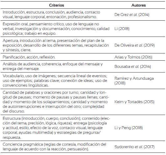 La rúbrica como instrumento en el que aparece un conjunto de criterios de distinto orden, se emplea tanto en investigaciones cuantitativas como cualitativas, mayormente en L1 y en menor medida en L2. Los criterios de cada una son distintos; por ejemplo, San-Valero et al. (2018) usan como criterios coherencia, contenido científico, diseño, impacto del mensaje, entusiasmo, lenguaje no verbal y uso de tecnología; en cambio, Gracia et al. (2018) emplean gestión de interacción, multimodalidad, prosodia, coherencia, cohesión textual, argumentación y léxico. Hay también rúbricas centradas en un género específico como el argumentativo. Así, Bugarcic et al. (2014) recurren a una rúbrica con tres criterios: afirmación, pruebas y razonamiento. Al respecto, se señala la diversidad de criterios hallados (tabla 1).