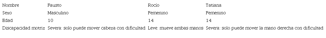 Fausto tenía 10 años y estaba en segundo de primaria, mientras que Rocío y Tatiana tenían 14 años y cursaban sexto de primaria. Rocío estaba integrada a un centro común de enseñanza, pero asistía en modalidad compartida entre una escuela de educación común y la escuela especial. Los tres niños presentaban un diagnóstico de pc, pero la severidad de la afectación motriz y el grado de disartria era distinta en cada caso. Fausto y Tatiana mostraban mayores dificultades motrices y en el habla. La afectación motriz es importante en la caracterización ya que determina la accesibilidad al uso de SAAC. La tabla 1 resume las características de los niños.