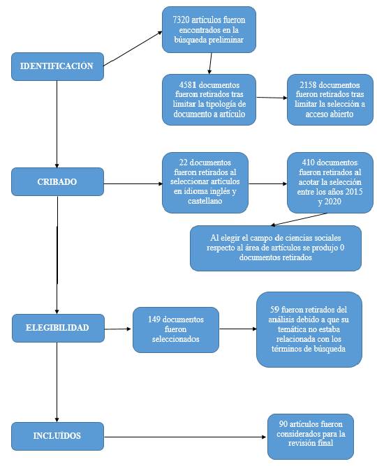 Los resultados inicialmente muestran que existe un número notable de estudios; en el momento de la búsqueda con los términos iniciales se obtuvieron 7320. Al hacer una depuración, los artículos aceptados fueron 149, de los cuales se excluyeron 59 debido a que no cumplían los criterios establecidos.