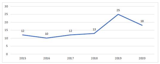 De los 90 documentos que se obtuvieron tras las etapas de cribado y selección, se puede determinar que la investigación con videojuegos en educación tiende a aumentar; tanto personal docente como la comunidad científica incluyen de algún modo a los videojuegos como un elemento significativo en su praxis educativa; ya sea como elemento complementario o central. Desde 2015 a 2018, se observa que el número de estudios es bastante similar, pero en 2019 se produce un crecimiento significativo, duplicando las publicaciones del año anterior y pasando de 13 a 25. Para 2020, las investigaciones hasta el momento de la revisión sistemática realizada son de 18. No obstante, cabe señalar que los estudios analizados en 2020 comprendían la mitad del total de ese mismo año, por lo que se esperaría que al terminar el periodo el número fuese mayor.