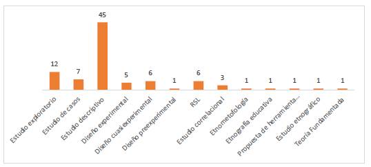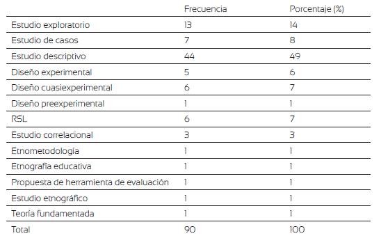 Respecto a los principales diseños empleados en los documentos, se puede observar que los estudios descriptivos son los más utilizados; de los 90 analizados, 45 utilizan este diseño, es decir, 49 % del total. Esto puede deberse a que se trata de un diseño elemental, el modo de aproximarse a un objeto de estudio que es propio de las primeras etapas de una investigación mayor, lo que permite reunir datos para un desarrollo futuro de teorías o investigaciones más amplias (Sans, 2004).