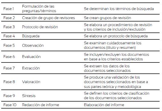 Petticrew y Roberts (2006) señalan que las revisiones sistemáticas se basan en una serie de fases que, ejecutadas de un modo consecutivo, llevarán al desarrollo óptimo de la revisión.