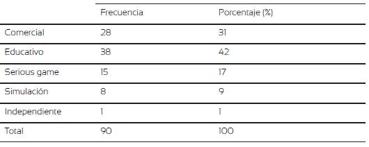 También se han tenido en cuenta las diferentes tipologías de videojuegos descritos en los estudios analizados, lo que posibilita conocer cuáles son los que conjugan videojuegos y educación. Los principales han sido a) los juegos educativos, b) los juegos comerciales, c) los serious games, d) los simuladores y e) los independientes.