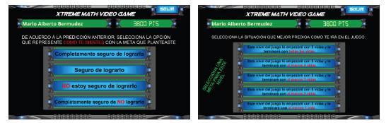 » Selección de juicio de autoeficacia. A continuación, el aprendiz debe emitir un juicio de autoeficacia sobre la base de la selección de la meta autoimpuesta. Para esto, el videojuego ofrece cuatro alternativas: a) completamente seguro de lograrlo, b) seguro de lograrlo, c) no estoy seguro de lograrlo, y d) completamente seguro de no lograrlo. Esto le permite al estudiante reflexionar sobre sus propias capacidades y, además, lo motiva hacia el logro de la meta seleccionada (figura 2).