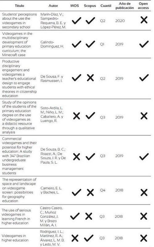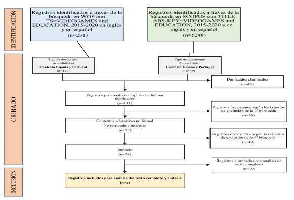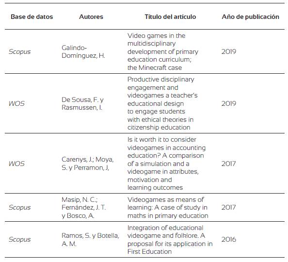 La selección de artículos se realizó consultando las bases de datos de WOS y Scopus, dado que son las principales fuentes de artículos de divulgación científica, lo que garantizó una mayor influencia y accesibilidad a revistas y artículos (Granda-Orive et al., 2013). Se optó por ser conservadores en la búsqueda, de tal forma que se pudiera obtener el mayor número de resultados. Así, los términos que se emplearon fueron "videogames" y "education".