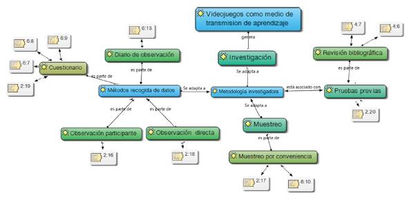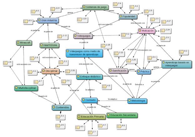 A partir de los artículos, se desarrollaron dos redes conceptuales: a) una relativa a los métodos utilizados para llevar a cabo la investigación y b) otra que abarca las prácticas concernientes a videojuegos educativos de dichas investigaciones. Estas redes se formaron teniendo en cuenta los datos y métodos expuestos en los diferentes artículos, de modo que se pudiera hallar aquellas prácticas comunes en las investigaciones de videojuegos como método de transmisión de aprendizajes. Además, para facilitar la exposición y comparación entre los datos expuestos por cada investigación, estos se agruparon en tres categorías: metodología, enfoque didáctico y videojuegos.