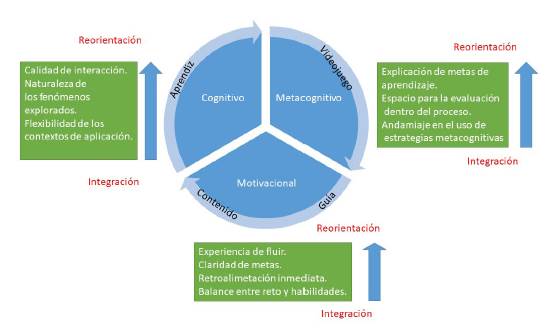 Investigadores quienes buscan la manera en que el videojuego sea un potencializador del pensamiento cientifico identifican tresestructuras que debe poseer un juego para tener cierta eficacia en la educación; estas representaciones son definidas desde la motivación la cual incluye elementos de curiosidad, retroalimentación, elogio, orientación a la motivación, fracaso divertido y estado de flujo; los elementos cognitivosque se articulan en simulación, cognición situacional, colaboración virtual, valor e identidad, preparación para resolver problemas del mundo real, y un tercer aspecto obedece a la metacognición que incluye conocimiento metacognitivo, contexto, identidad, metamemoria y competencia metaestratégica (Morris et al., 2013). Estos elementos se ven con mayor claridad en la figura 1, al mostrar la estructura de los elementos enunciados anteriormente y adaptados para Colombia en los niveles de representación de los videojuegos bajo el mecanismo de la integración y la reorientación (Montes et al., 2018).