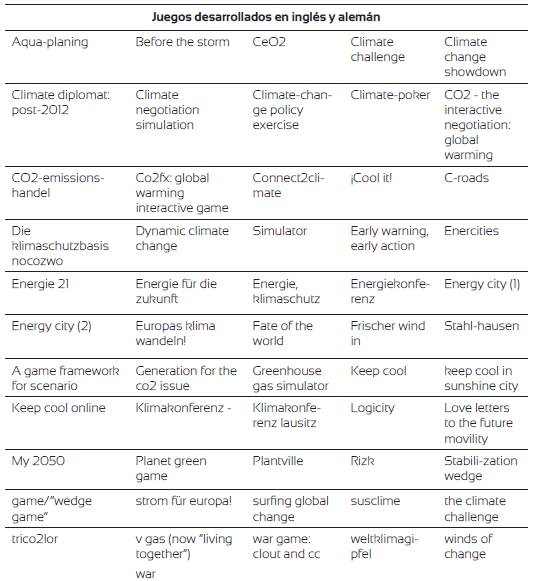 Investigadores de la Universidad de Columbia, en Nueva York, y de la Universidad de Oldenburg, en Alemania, realizaron una revisión de la literatura, en alemán e inglés, sobre juegos cuyo contenido fuera el cambio climático. Esta revisión tuvo como objetivo brindar una descripción general de los juegos relacionados con cambio climático en general, estructurar la amplia gama de aplicaciones al respecto y analizar una selección sobre el desarrollo temporal del campo, actores involucrados en el desarrollo de juegos, formatos y focos temáticos (Reckien y Eisenack, 2015). Los juegos que identificaron con mayor relevancia se muestran en la tabla 1.
