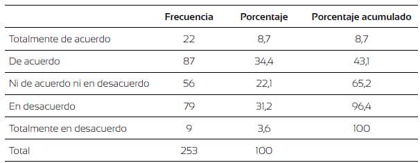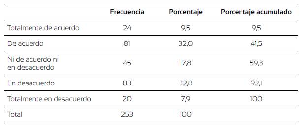 Para el análisis se considera la sumatoria de los Totalmente en desacuerdo y en Desacuerdo como SI y a los Totalmente de acuerdo y De acuerdo como NO.
