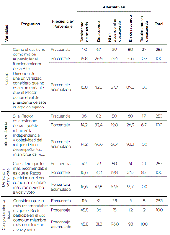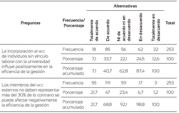 En cuanto al número óptimo de integrantes del MCC, para garantizar eficiencia en la gestión de la universidad, se aprecia que el 52,6% sostiene que debería ser menor a 12 miembros y el 47,4% mayor a 12, lo que refleja una clara paridad de opiniones, tal como se muestra en la Tabla 2.