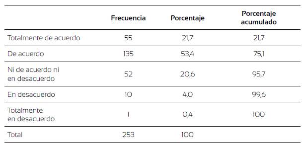 Se realizaron diferentes preguntas relacionadas con este aspecto. Para el análisis se consideraron las respuestas Totalmente de acuerdo y De acuerdo como SI y Totalmente en desacuerdo y En desacuerdo como NO.