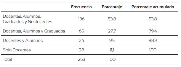 El 53,8% de los expertos opinó que los cuatro claustros deberían estar representados en el MCC y un 25,7% que deberían estar representados tres claustros (docentes, alumnos y graduados); es decir que la mayoría opinó en línea con lo prescripto por el Art. 53 de la LES que impone que los órganos colegiados de gobierno estén integrados asegurando la participación de los cuatro claustros, el de graduados en forma optativa.