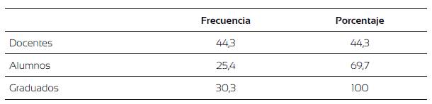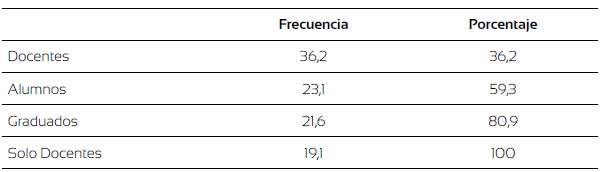 En cuanto al porcentaje de participación que debería tener cada claustro, se encontró que los expertos opinan de manera divergente a la LES, le otorgan un mayor grado de paridad a la representación y eliminan la preponderancia del claustro docente (Tabla 4). Si bien un amplio porcentaje opina que los docentes deben tener mayoría, la participación desciende a 36,2% lejos del más del 50% fijado por la LES. Además, la opinión de los expertos deja a la evidencia una gran paridad respecto del porcentaje de participación que deberían tener el resto de los claustros, 23,1%, 21,6% y 19,1% para alumnos, graduados y no docentes, respectivamente.
