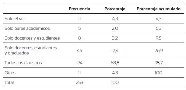 En primer lugar, se consulta a los expertos respecto a qué claustros considera deberían integrar el MCC. Los resultados se muestran en la Tabla 3.
