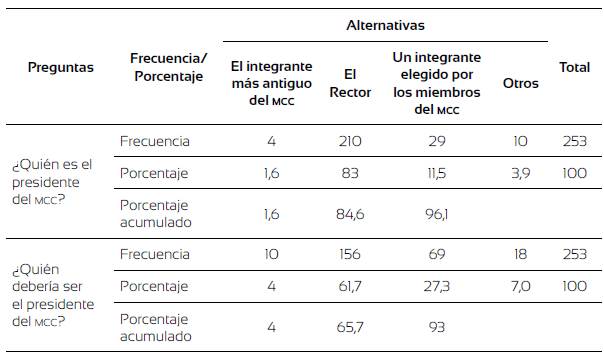 Como parte del análisis de la composición de los MCC, se consultó a los expertos sobre quién era el presidente del MCC de su universidad y más de las dos terceras partes respondió que el presidente del MCC en su universidad era el Rector. Por otra parte, al consultarlos sobre quién debería ser el presidente del MCC la mayoría, el 61,7%, respondió que el presidente del MCC debía ser el rector. Estos resultados ratifican con claridad la posibilidad de la existencia de problemas de doble rol descriptos por la TA (Tabla 9).