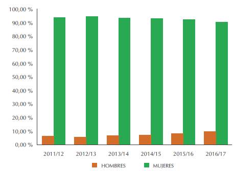 Los resultados de dicho estudio demostraron que las tres titulaciones tildadas durante gran parte del siglo XX como "naturalmente femeninas" (Enfermería, Trabajo Social y Magisterio) continuaban presentando porcentajes de alumnado femenino claramente superiores al masculino. En el caso de Enfermería, con un 20,6% de alumnado masculino matriculado en el curso 2016-2017 en esta universidad, algunos factores, como las buenas expectativas profesionales y económicas de dicha titulación de los últimos lustros, pueden explicar el incremento constante de alumnado masculino, aunque los porcentajes están aún lejos del equilibrio. En Trabajo Social, el número de alumnas matriculadas es de un 83,7% (16,3% de alumnos varones), una realidad que sigue demostrando cómo la asociación entre feminidad y servicios, entre ellos el cuidado, siguen constituyendo parte de un ideario asumido e interiorizado que inclina, en la mayoría de los casos inconscientemente, hacia terminadas opciones formativas y profesionales.