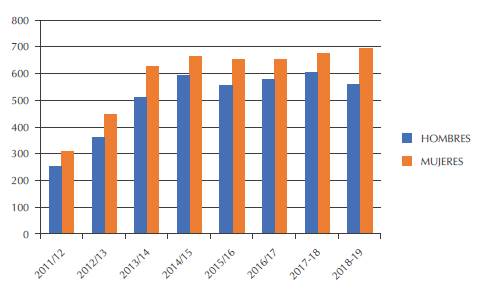 Quince años después de estas primeras investigaciones y aunque los resultados, en términos generales, sean más halagüeños, el lento camino hacia el equilibrio queda seriamente cuestionado cuando planteamos el análisis desde la base: la distribución de alumnas y alumnos en la enseñanza superior por ramas de conocimiento; en lo que se detecta una presencia abrumadora de varones en las ramas de ingeniería frente a la feminización de ramas como Ciencias Sociales y Jurídicas, focalizada en Trabajo Social y fundamentalmente Educación. Sin embargo, si bien se está trabajando para ampliar la presencia femenina en lo que se ha denominado como carreras STEM,1 no se ha articulado ninguna medida para paliar los desequilibrios existentes en los espacios formativos y profesionales feminizados, pese a que contribuyen igualmente, no solo a perpetuar los sesgos genéricos sino, como se expondrá a lo largo de este trabajo, también el desprestigio de las profesiones consideradas como femeninas.