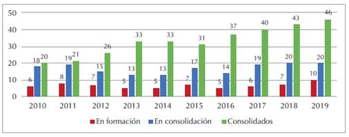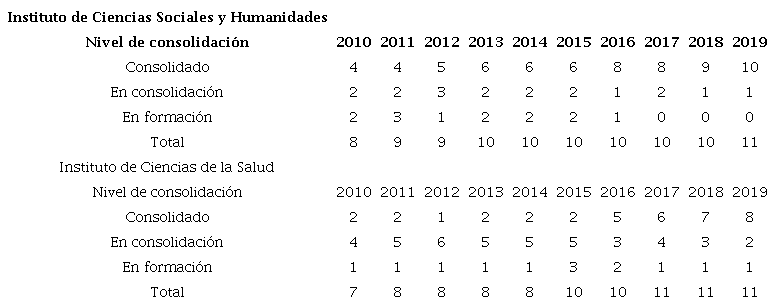 En este estudio se ha analizado la evolución de los CA de ICSHU e ICSA, por tener dimensiones y características de desarrollo similares y en su dinámica organizativa. El ICSHU cuenta con 8 áreas académicas y el ICSA con 7, en las que se encuentran adscriptos los PTC, cuyos resultados académicos e investigativos se ven reflejados en la evolución de los CA en ambas dependencias. En la tabla 2 se muestran las cifras referentes al nivel de consolidación alcanzado en el periodo 2010-2019.