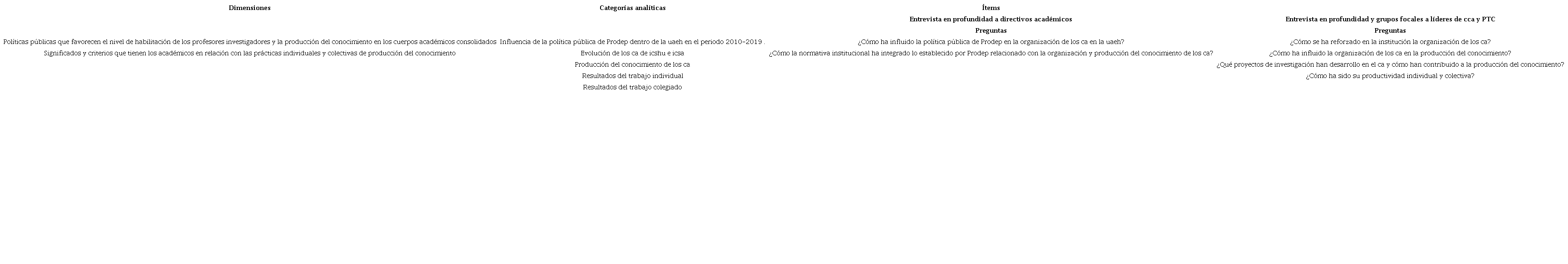Como parte de la congruencia teórico-metodológica del estudio, se identificaron las dimensiones que caracterizan la influencia de la política pública de Prodep en la dinámica organizacional de los CA y las categorías analíticas que resultan de la existencia y funcionamiento de los CAC objetos de estudio, según se refieren a continuación en la tabla 1, la cual conduce la elaboración de las preguntas de las entrevistas y grupos focales implementados.